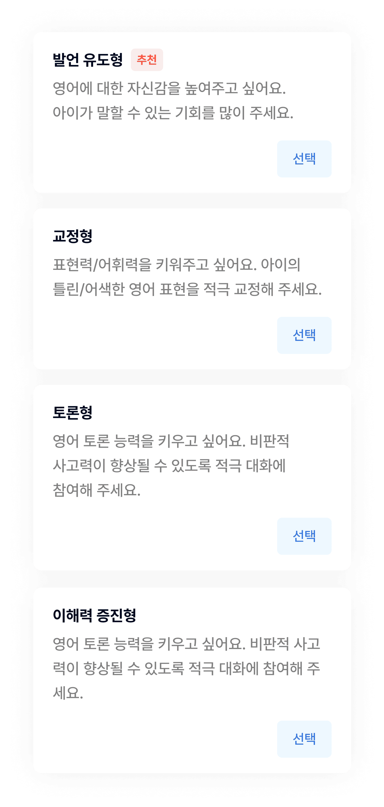 수업 모드부터 집중 교정 영역까지 꼼꼼히 설정할 수 있어요. 짧은 수업 시간 동안 자녀에게 꼭 필요한 것에 집중하세요.
