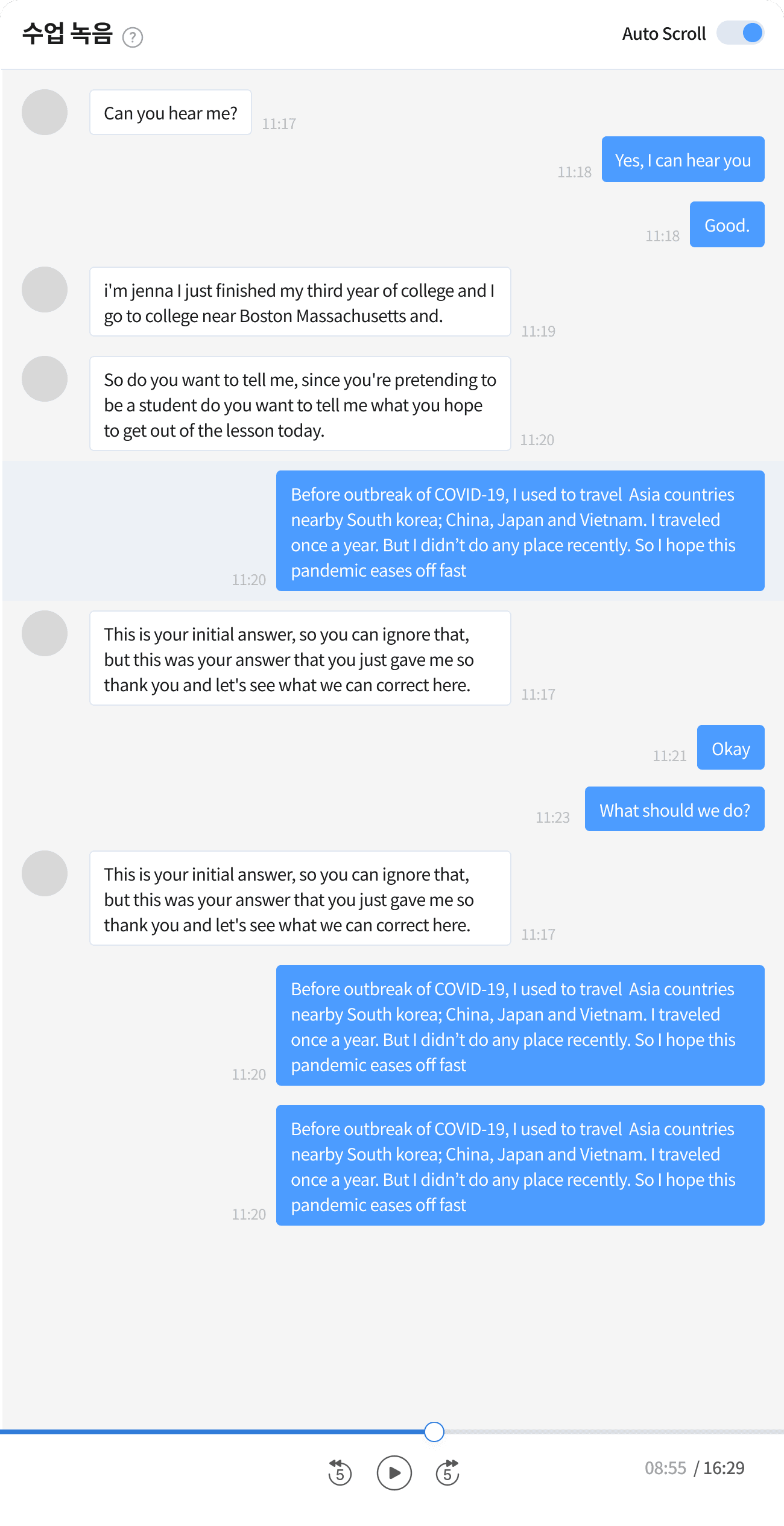1:1 원어민 수업 시간 동안 이야기한 내용은 모두 녹음되어 자동으로 스크립트로 만들어집니다. 자녀가 수업을 잘 마쳤는지, 튜터와 어떤 대화를 했는지 확인해보세요.